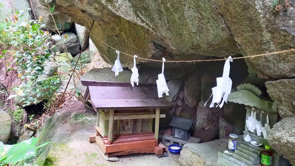 この岩が御神体(神様がやどる場所)で、海上安全の神様である磐長姫命(いわながひめのみこと)が祀られています。