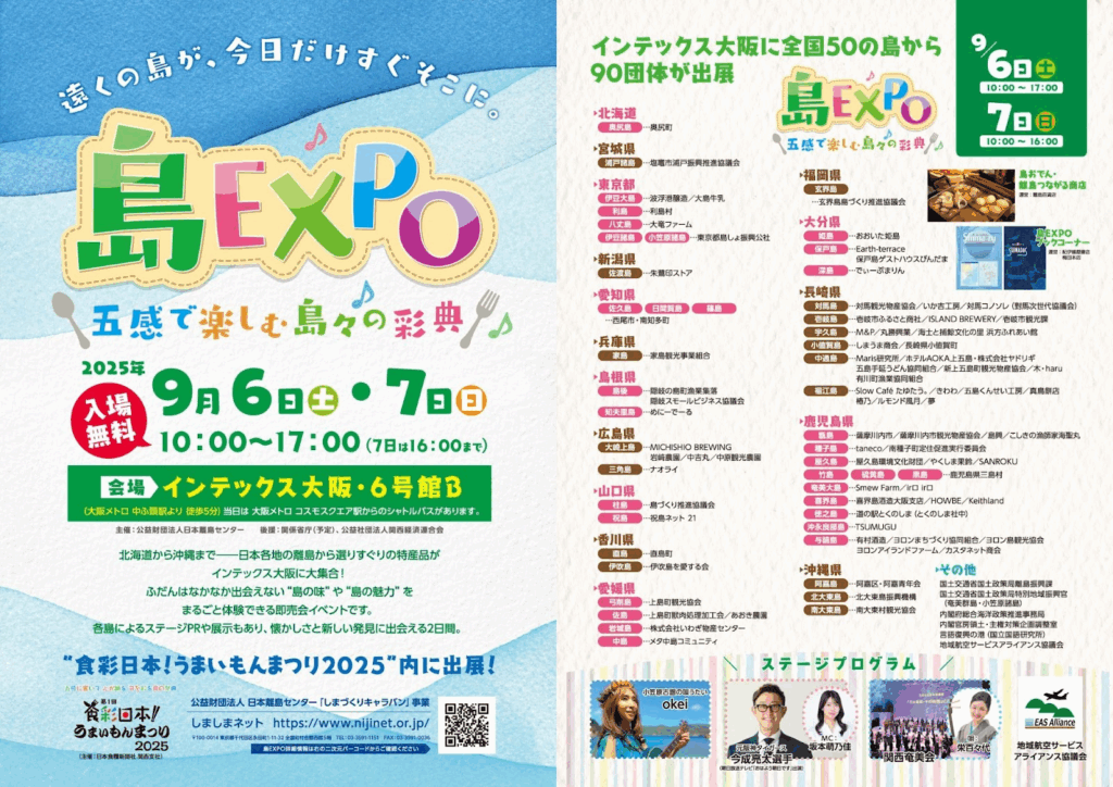 2025年9月6日(土)・7日(日)、インテックス大阪で、日本離島センター主催のイベント「島EXPO――五感で楽しむ島々の彩典」が開催されます。全国50の離島が集結し、特産品の販売や島唄・島踊りの披露など、島の魅力を五感で楽しめるチャンスです。