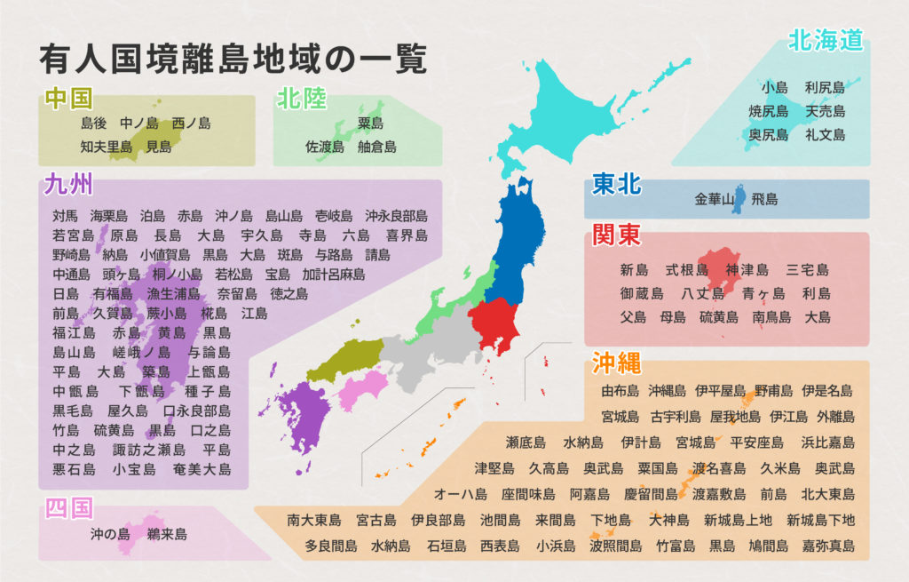 473島ある国境離島のうち、148島が国の指定する「有人国境離島地域」に属しています。