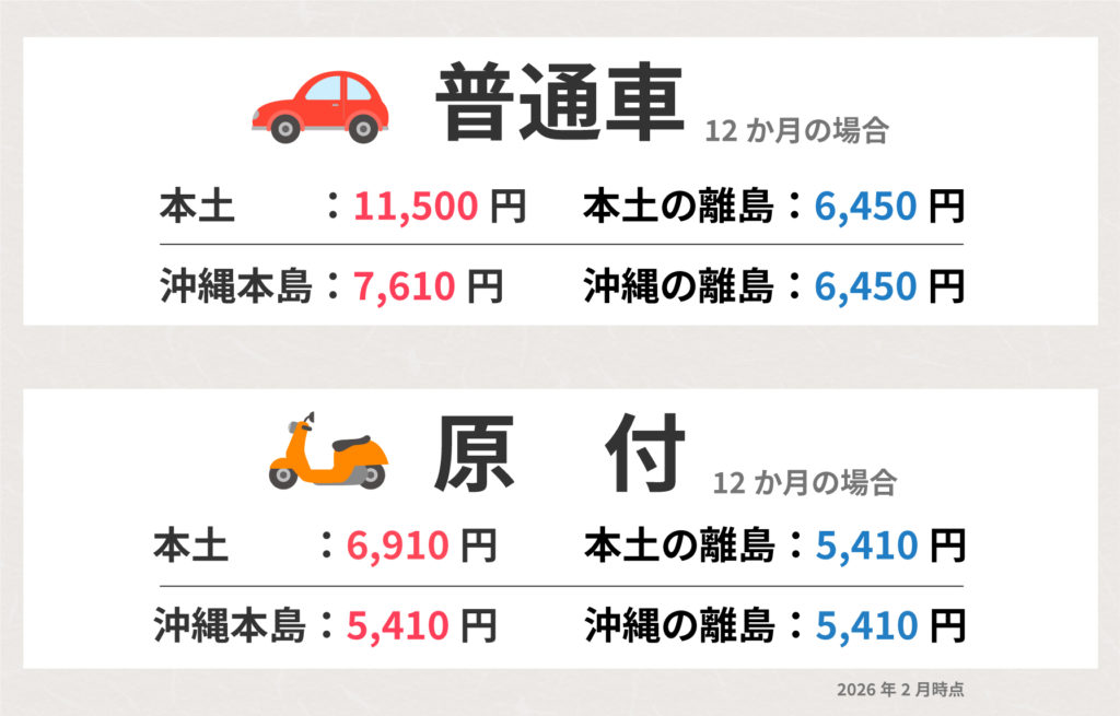 例えば、普通車・12か月の場合(2026年2月時点)、掛け金は次のように設定されています。