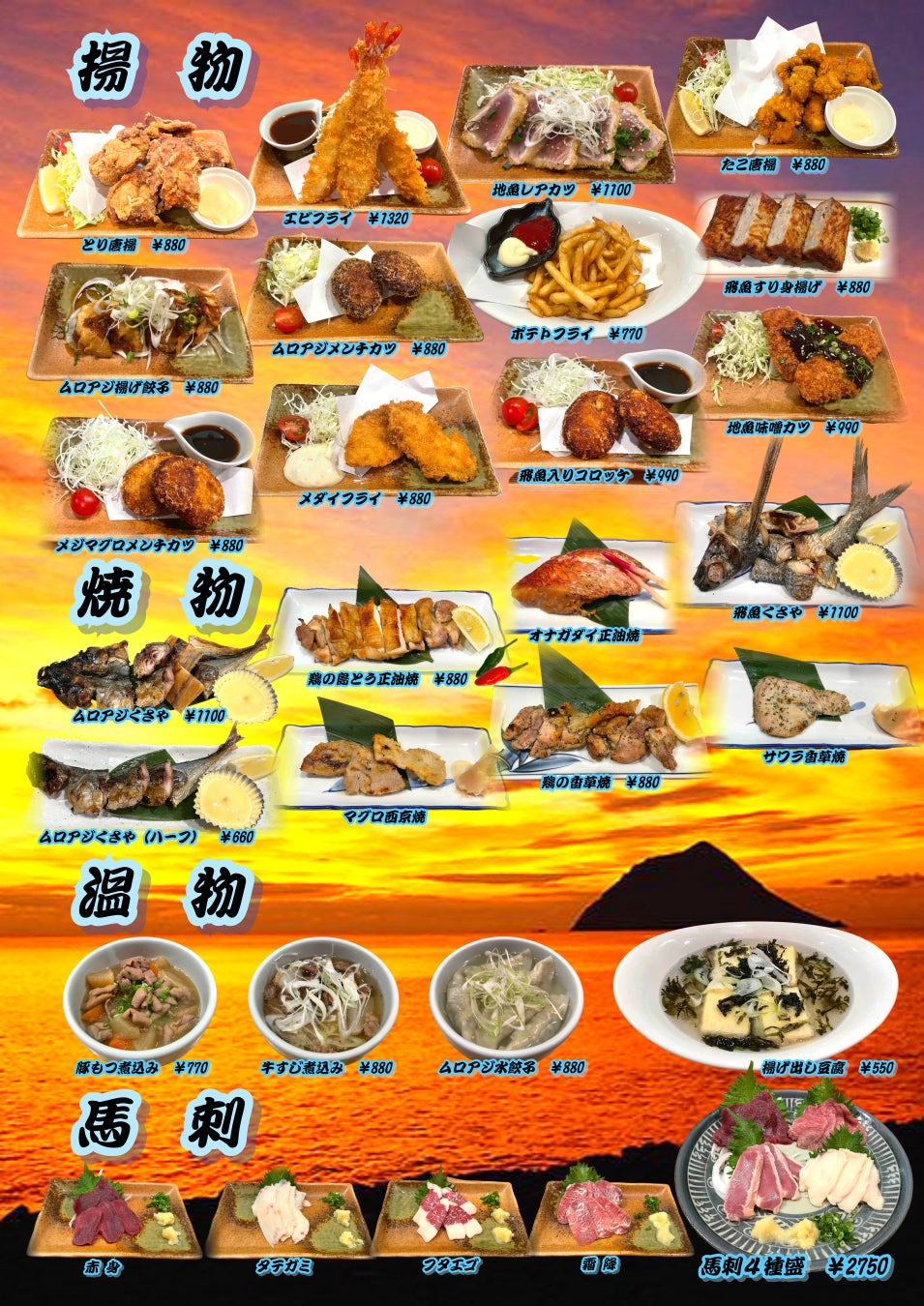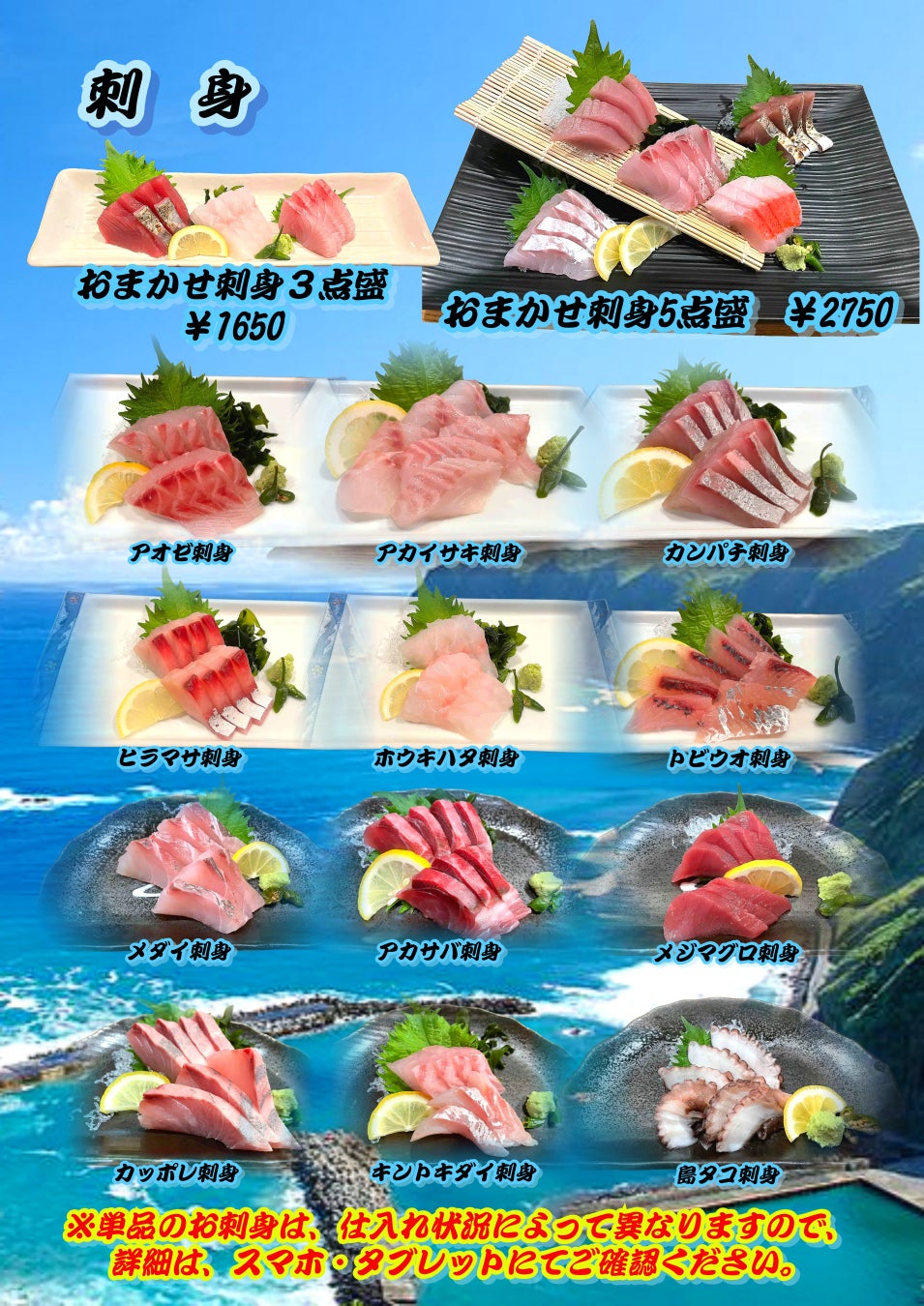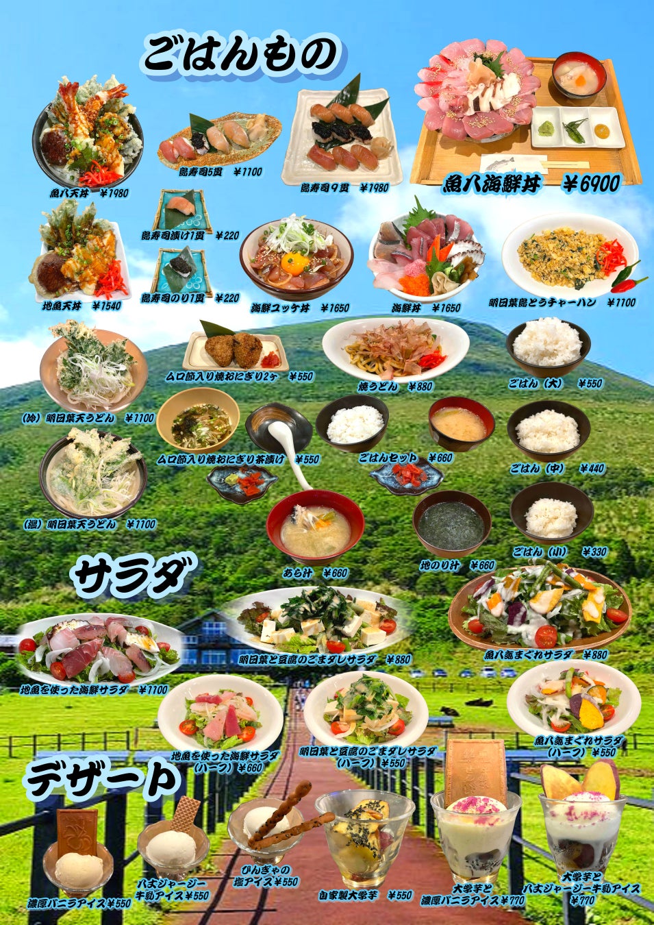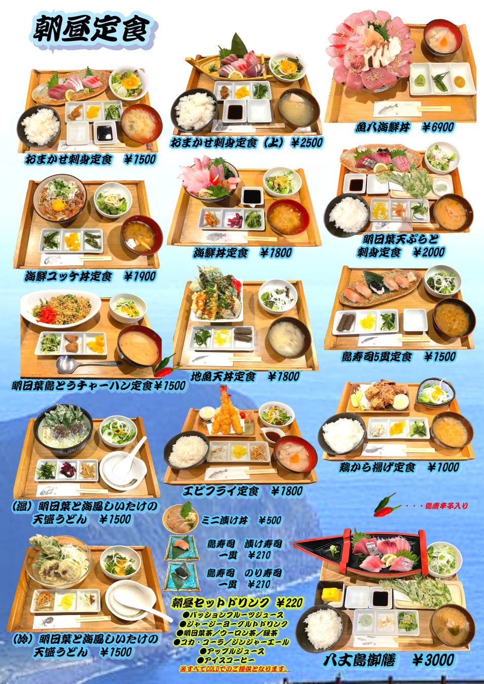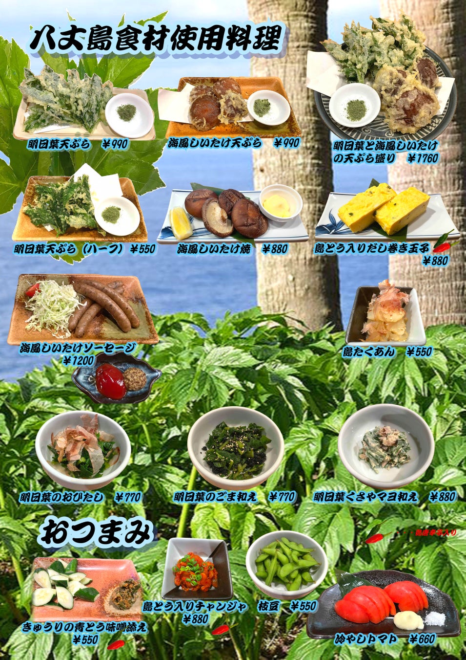八丈島特産の明日葉、島唐辛子、八丈レモン、そして海風しいたけなど、特産を多くの方に愛していただけるよう、誰でも食べやすく調理することで、思いやりとおもてなしの心をこの八丈島で、自然の恵みと一緒に食す醍醐味を味わっていただきたい一心で、従業員一同、心新たに邁進して参りたいと思います。当店では、八丈島で水揚げされた新鮮な地魚を5種以上漁師さんから仕入れており、鮮度が落ちないよう工夫してお客様にいろいろな料理法で心を込めてご提供しております。