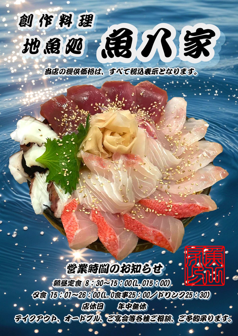 八丈島に開店してから10年の節目の年、料亭イメージの魚八亭から皆家族的なアットホームで落ち着けるお店「魚八家(うおはちや)」へと生まれ変わります。