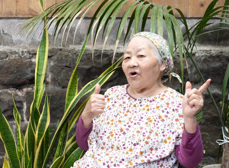 昭和14(1939)年4月19日東京都八丈島八丈町中之郷の藍ヶ江で生まれる。約60年間でのべ10万人が訪れたともいわれる中之郷の民宿「ガーデン荘」を経営する、八丈島を代表する名物女将。エネルギッシュな話術と、島の豊かな海の幸で握った島寿司で、宿泊客に元気と安らぎを提供している。近年、猫の奥ゆかしい世界に興味を持ち、猫は「可愛さ」だけでなく、「深くて怪異的な力を持っている二面性のある生き物である」という考えのもと、「猫にだまされた話を聞いたことがないか?」と聞き取り調査をしている。メディア出演多数。