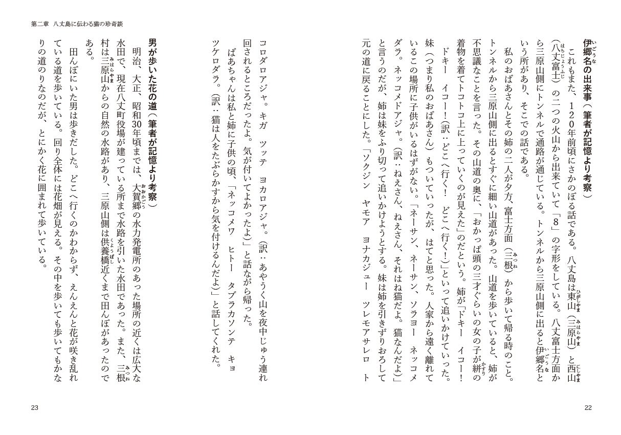 八丈島をご存知ない方向けに、「全域地図」と「本書で登場する場所を示した図」をカラーで掲載。また、前述のとおり、えいこば特有の言葉遣いや八丈島方言については、八丈語研究者・金田章宏が日本語対訳を担当しています。研究者だけでなく一般読者も、かつての離島で人がどのように生きていたのか、「猫」という存在をどうとらえていたのかが楽しめる構成になっています。