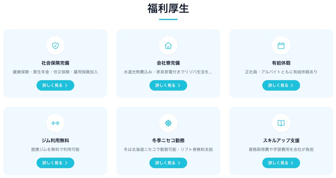 ・ジム利用無料、家族無料ツアー、資格取得全額支援 等