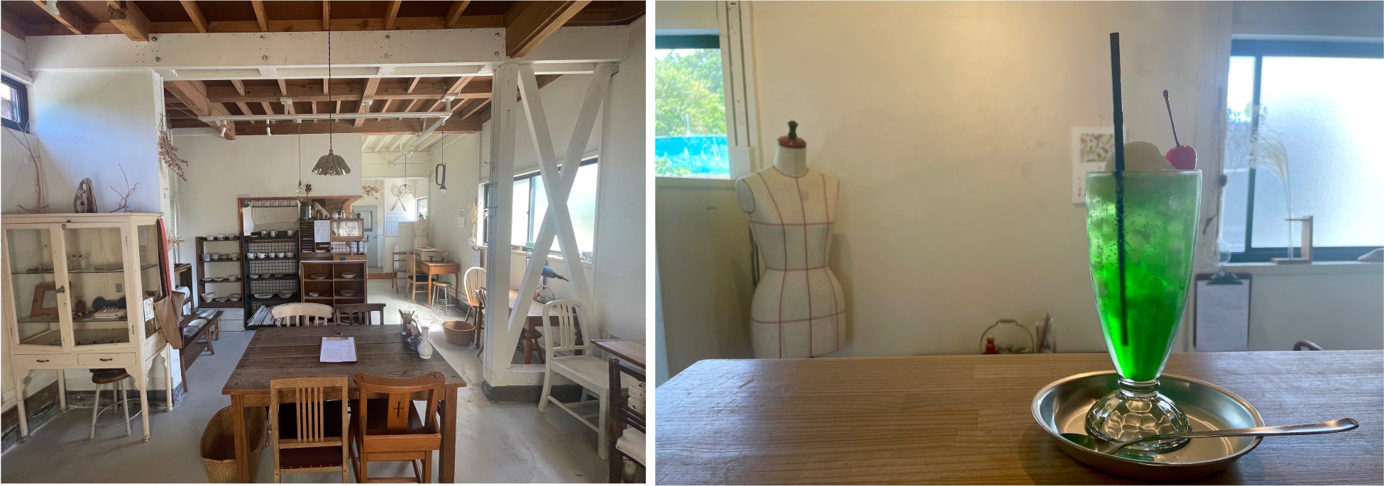 大島にある喫茶とうつわのセレクトショップクリームソーダをはじめとするドリンクをオリジナリティあるグラスとともに楽しめます。グリーンカレーなどの料理も提供しており、落ち着いた店内でゆったりとした時間を過ごせます。