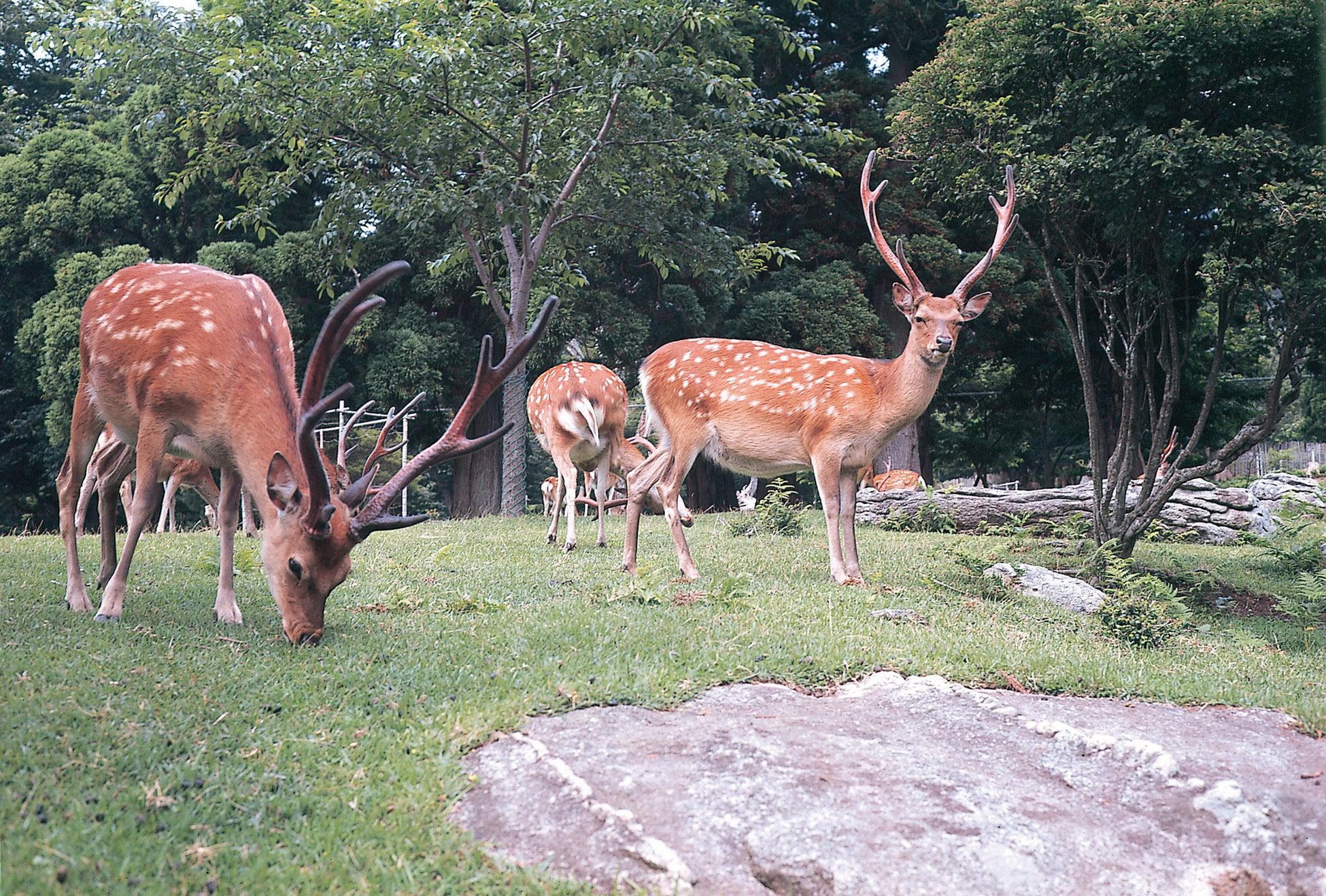 島に暮らす人は神社で働く数名のみですが、野生のシカは約500匹も生息。「神の使い」として大切に保護されています。