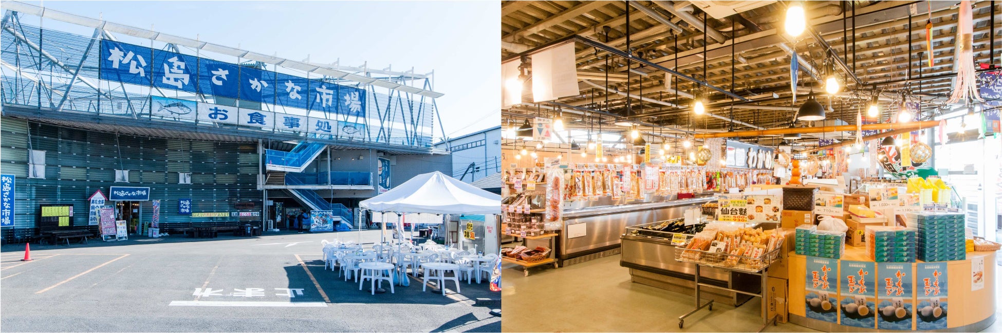 三陸の新鮮な魚介類1500種類以上を取り扱う観光市場。2階には食事席があり鮮度抜群のネタが味わえる寿司や豪快な海鮮丼はもちろんオリジナルの「松島かきバーガー」が人気を誇っています。併設する「焼がきハウス」では1年中カキの食べ放題が開催されています。