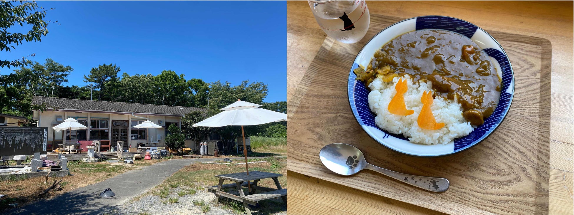 店内は休憩スペースと猫グッズを中心とした物販スペースがあり、「にゃんカレー」や「きつねこうどん」、「牡蠣の潮汁」といった食事やドリンクの提供を行っている観光客向けの休憩所です。