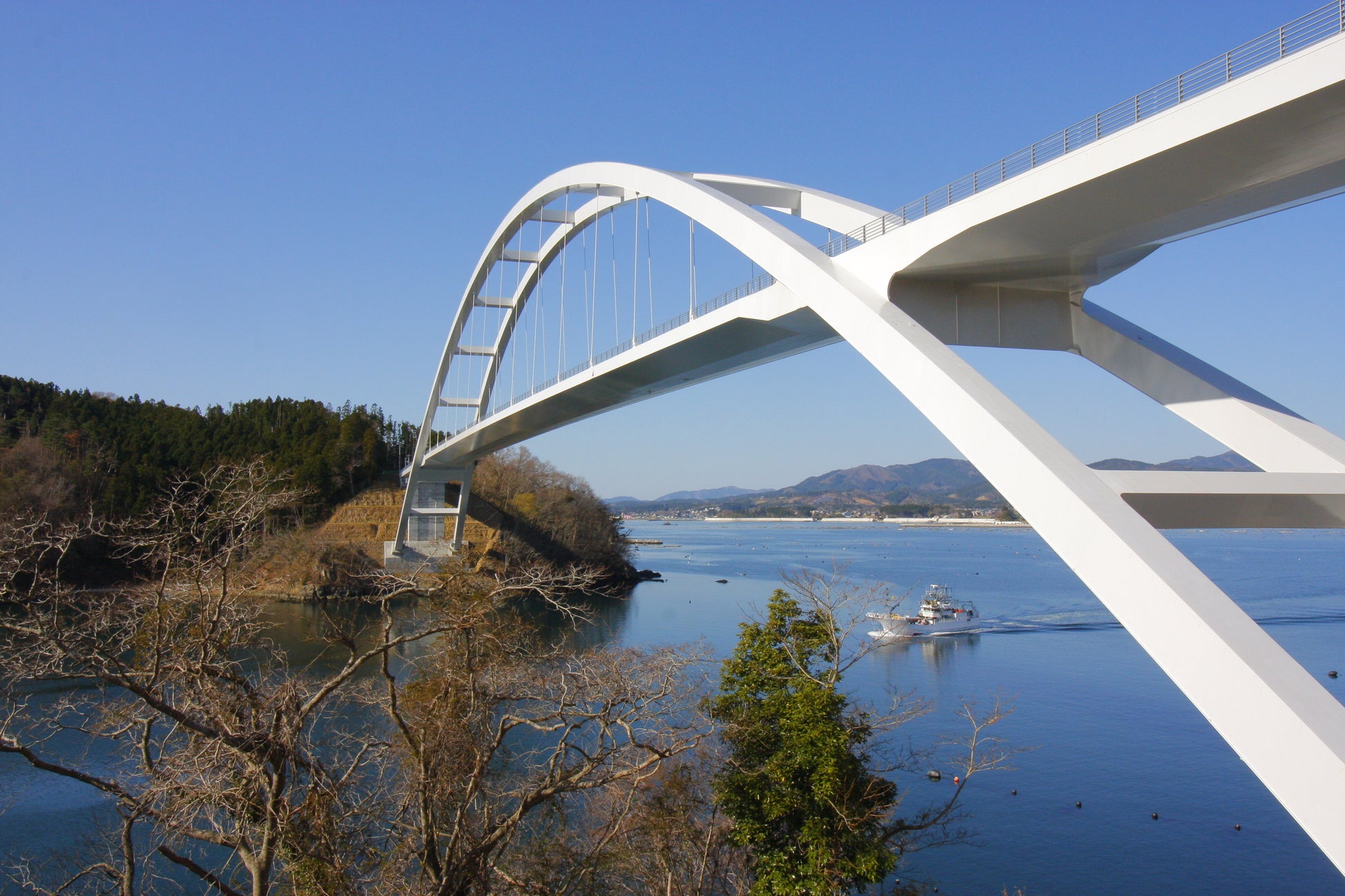 全長297mのアーチ橋で、本州と離島を結ぶ東北初の橋梁。雄大な海を望みながら橋を渡る瞬間は“海の上を走るような”非日常感を味わえます。