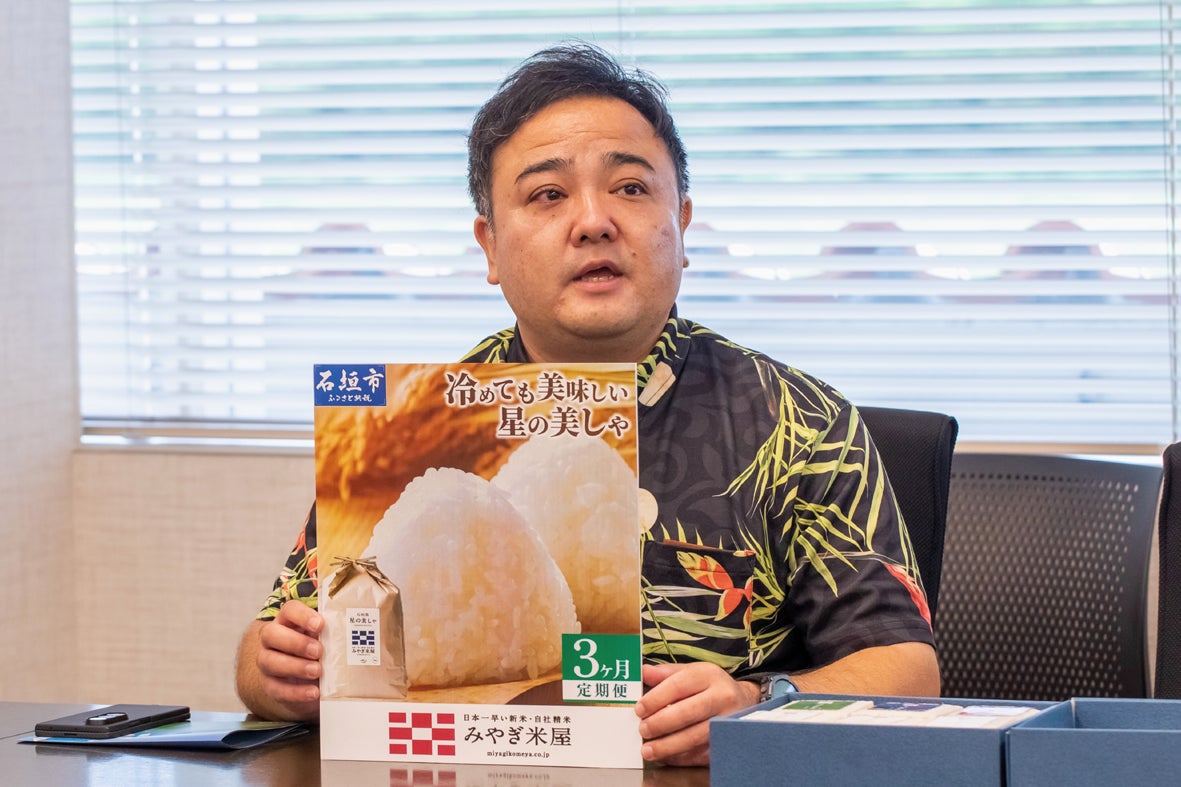 米どころ石垣島で「お米といえば みやぎ米屋」と島人は口をそろえる。地域密着、創業60年の老舗で島内一般家庭はもとより島中のホテル・レストラン・飲食店を客に持つ。生産圃場は沖縄県内最大規模(60ヘクタール)、品質管理に有資格者であるお米マイスター2名、銘柄・等級判定 農産物検査員5名を擁する。そのみやぎ米屋が昨年、初の島外出荷を経験した。「きっかけは、ふるさと納税出品でした」と、宮城智一さん。以来引き合いは高く、注文は続く。新市場向けに目印となる自社アイコンを一新、社名の上へ一行「日本一早い新米・自社精米」とキャッチフレーズも入れた。さらに今年はオンライン拡販を視野に自社米3種食べ比べセットを上市。「珊瑚とカンムリワシを守る自社田で育てています。冷めても美味しい石垣のお米です。食べて、お声をお聞かせください」PRにも余念はない。