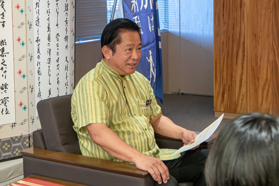 石垣市 中山義隆市長は、石垣市ふるさと納税で人気の返礼品 出品者を市役所へ招き、令和7年を振り返り、来年の抱負を確認。会へは市内の高校生も飛び入り参加した。