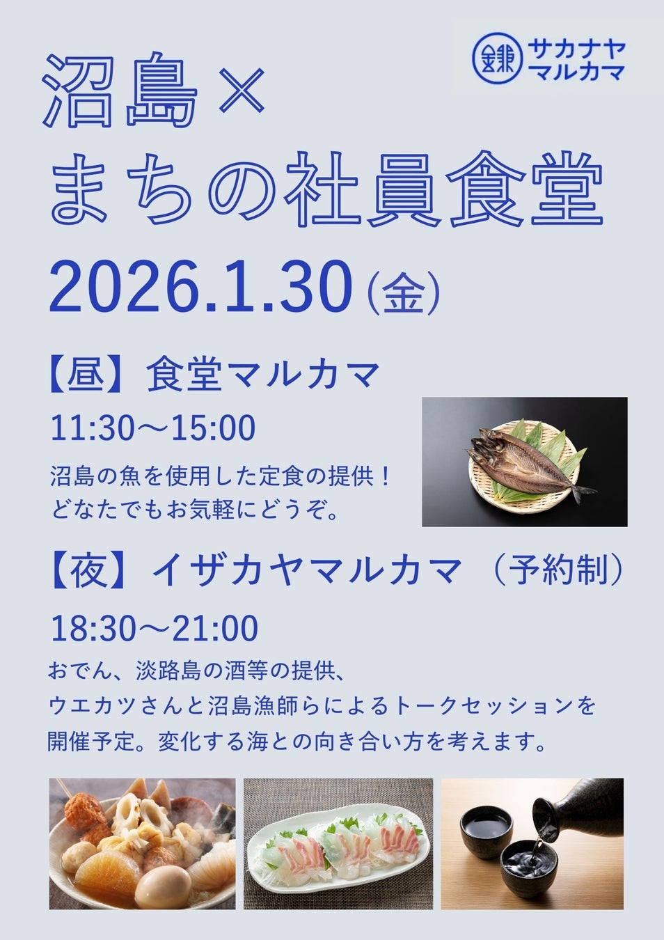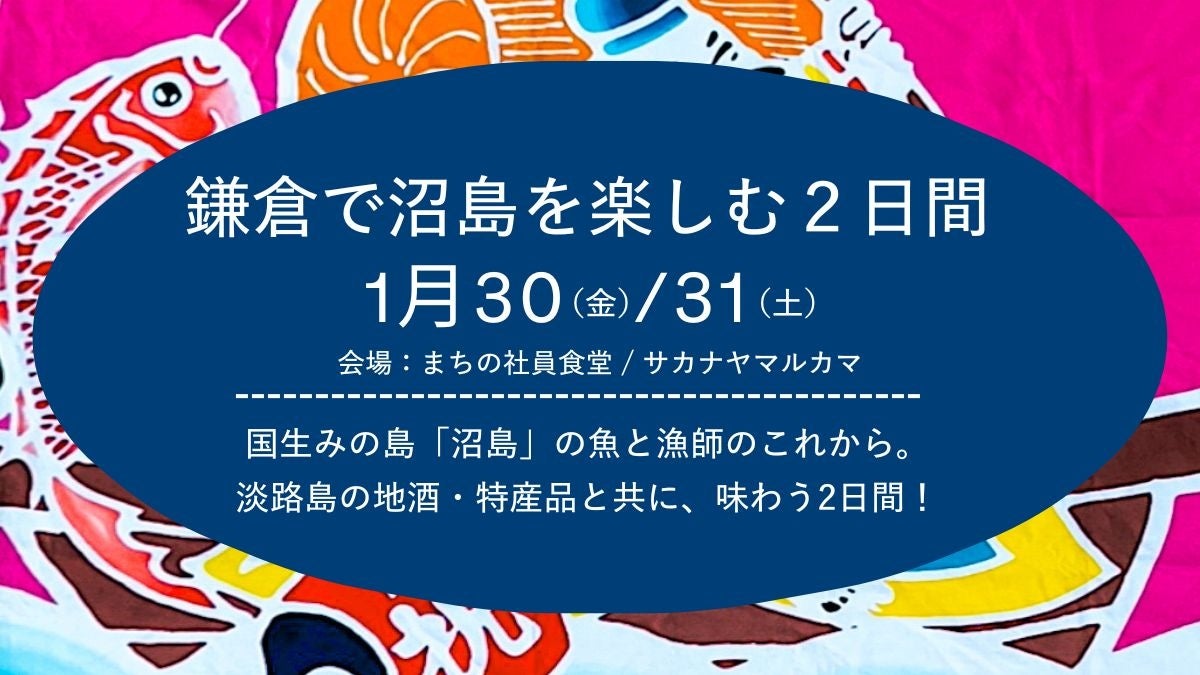 1日目は、鎌倉駅近くの「まちの社員食堂」にて、沼島の海の幸を味わえる1日限定の「食堂マルカマ」と夜の部「イザカヤマルカマ」をオープン。夜の部では、沼島の伝統漁法・一本釣りの現状や、変化する海との向き合い方を考えるトークイベントも開催します。(夜の部のご予約はこちらから)