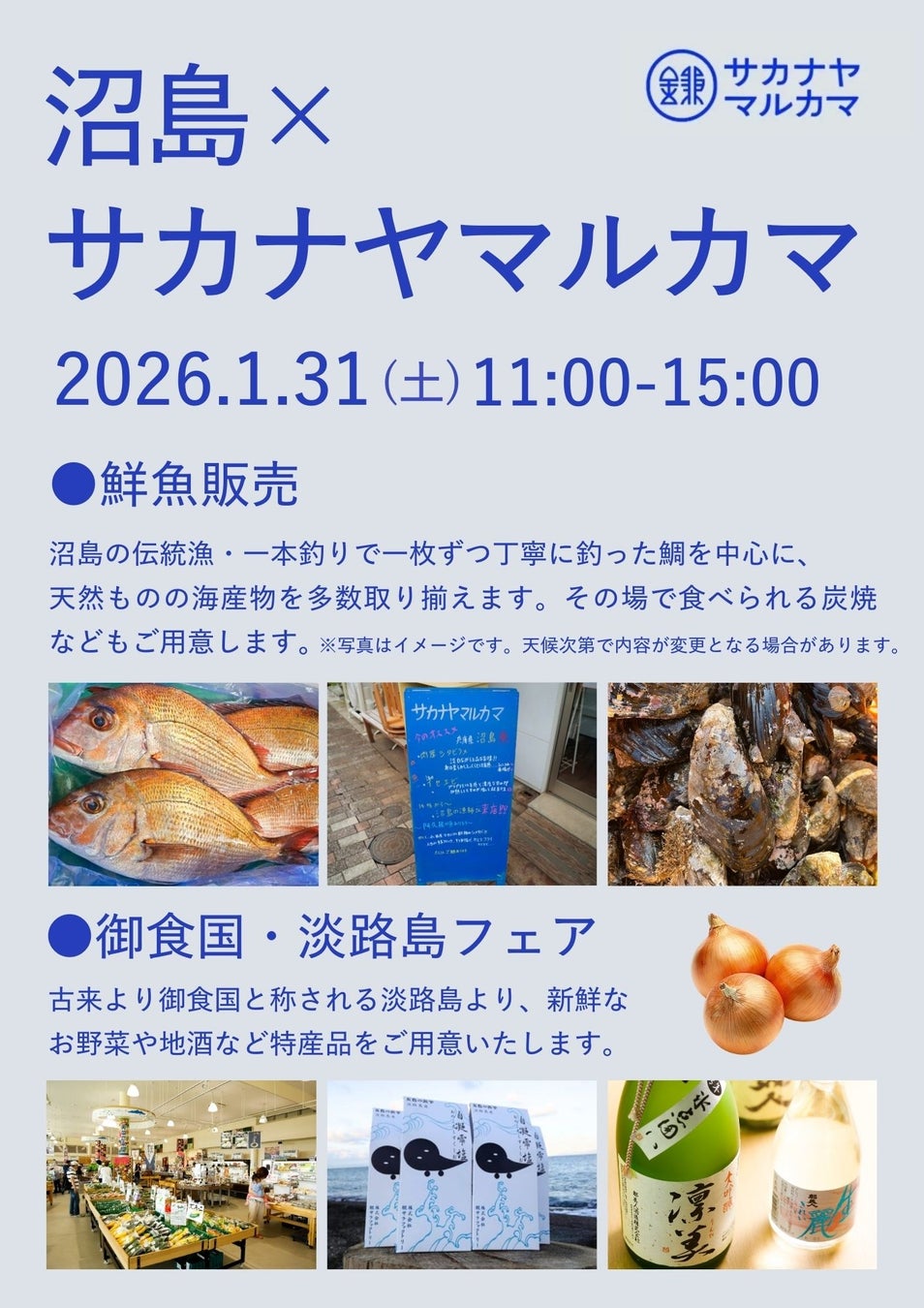 2日目は、鎌倉・今泉台にある「サカナヤマルカマ」店舗にて、沼島の海産物や炭焼、淡路島の特産品の販売等を予定しています。古来より皇室などに食材を提供する御食国(みけつくに)として知られる淡路島。そんな淡路島の食材と、沼島の漁師との交流をぜひお楽しみください。