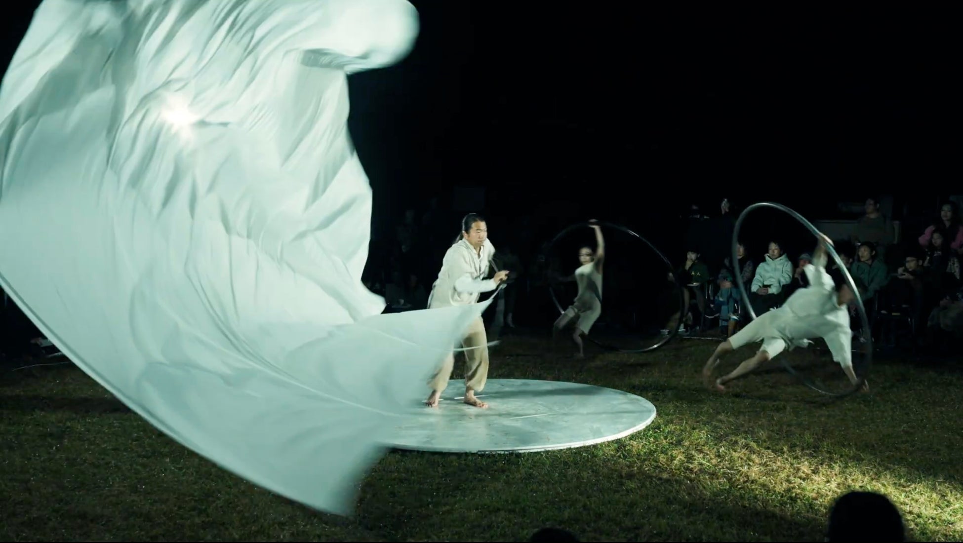 大旗が風をまとい、シルホイールが光をなぞる、自然を感じるサーカス