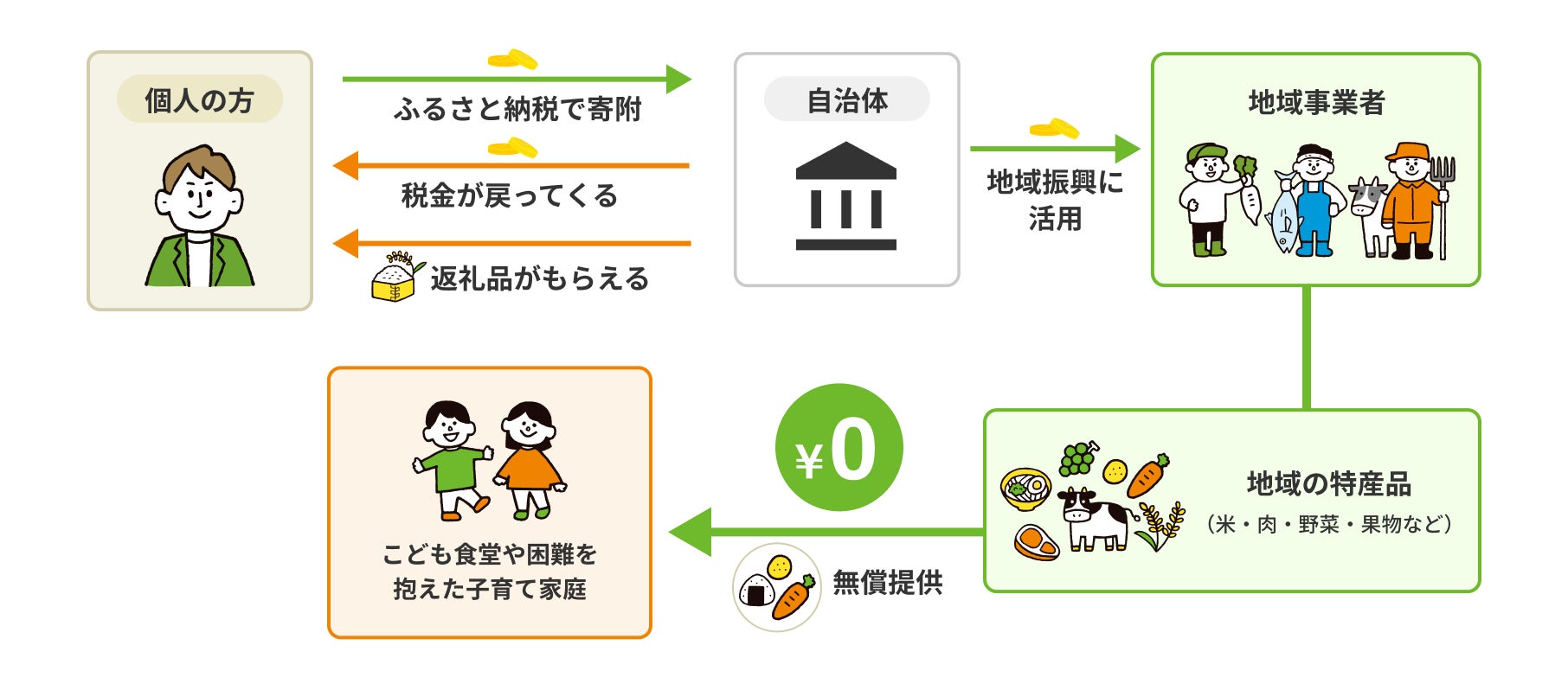 「こどもふるさと便」は、ふるさと納税を財源として、生産者・農協・漁協・食品メーカーなど地域の事業者と連携し、地域の産品を“応援品”として、こども食堂や困難を抱える子育て世帯に届ける、新しいフードバンクの仕組みです。