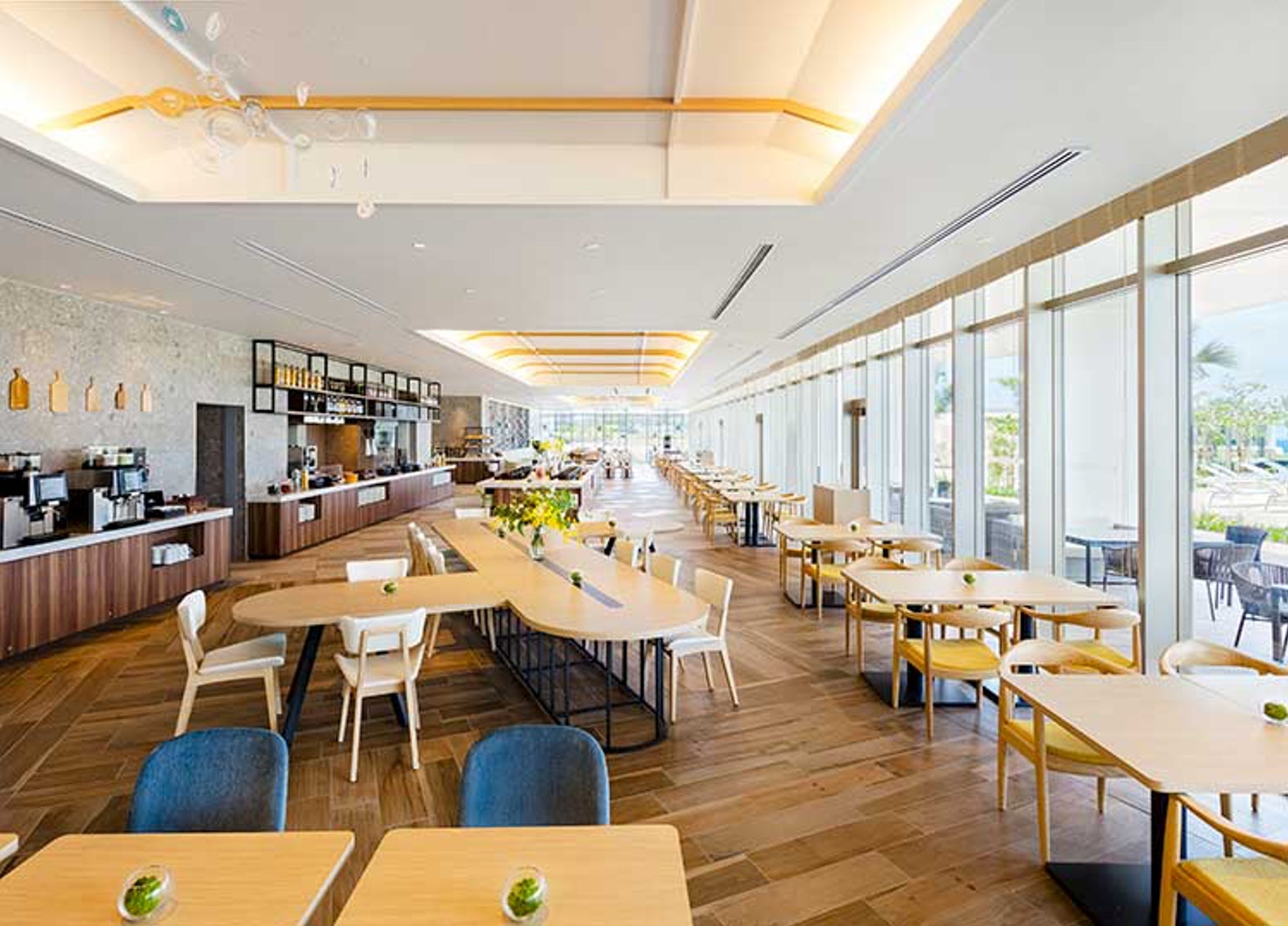 ソファーでゆったりと寛ぎながら、青く輝く圧巻のオーシャンビューや水平線に沈む夕日の絶景、そして夜空に瞬く満天の星を眺めることができるロビーラウンジ&バー「ハナリ」。コーヒーや紅茶、カクテルなどのアルコール類も取り揃えています。大切な方や友人との気軽なティータイムや、ロマンチックなバータイムにぜひご利用ください。