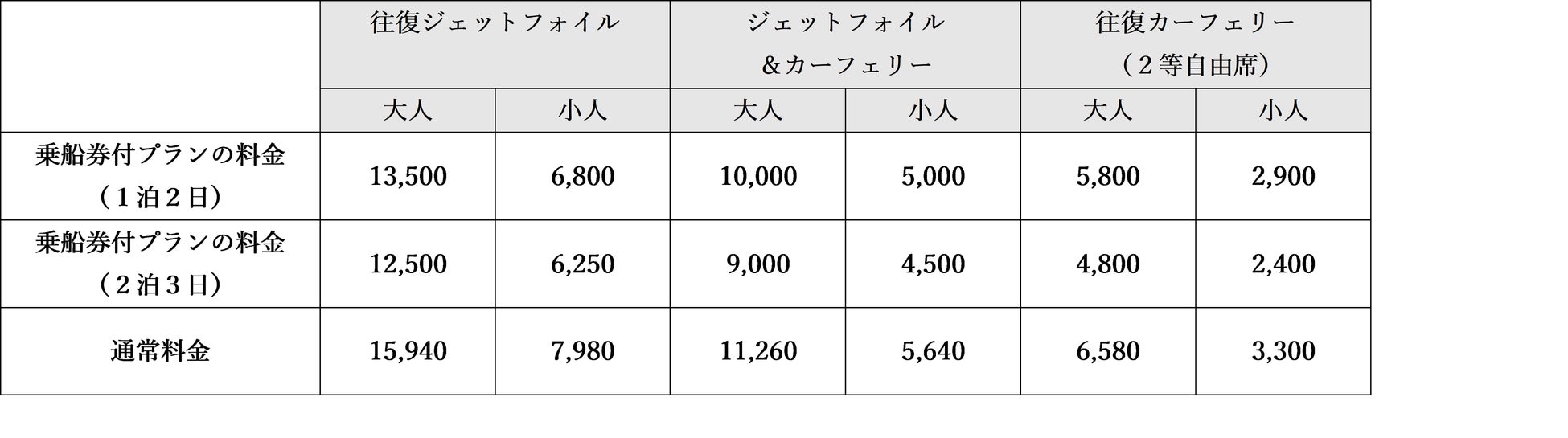 各体験商品の体験料に、以下の佐渡汽船乗船料金が加算された額がプラン料金となります。
