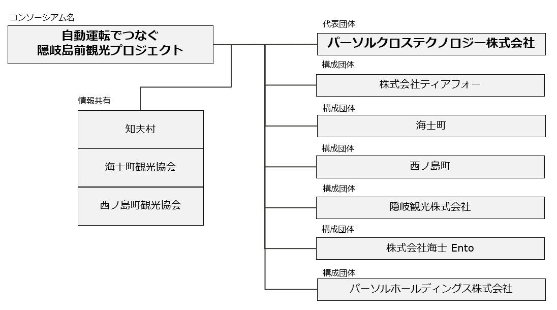 本実証実験に伴い、各関係団体とともに「自動運転でつなぐ隠岐島前観光プロジェクト」というコンソーシアムを立ち上げました。コンソーシアムを構成する団体は下記の通りです。