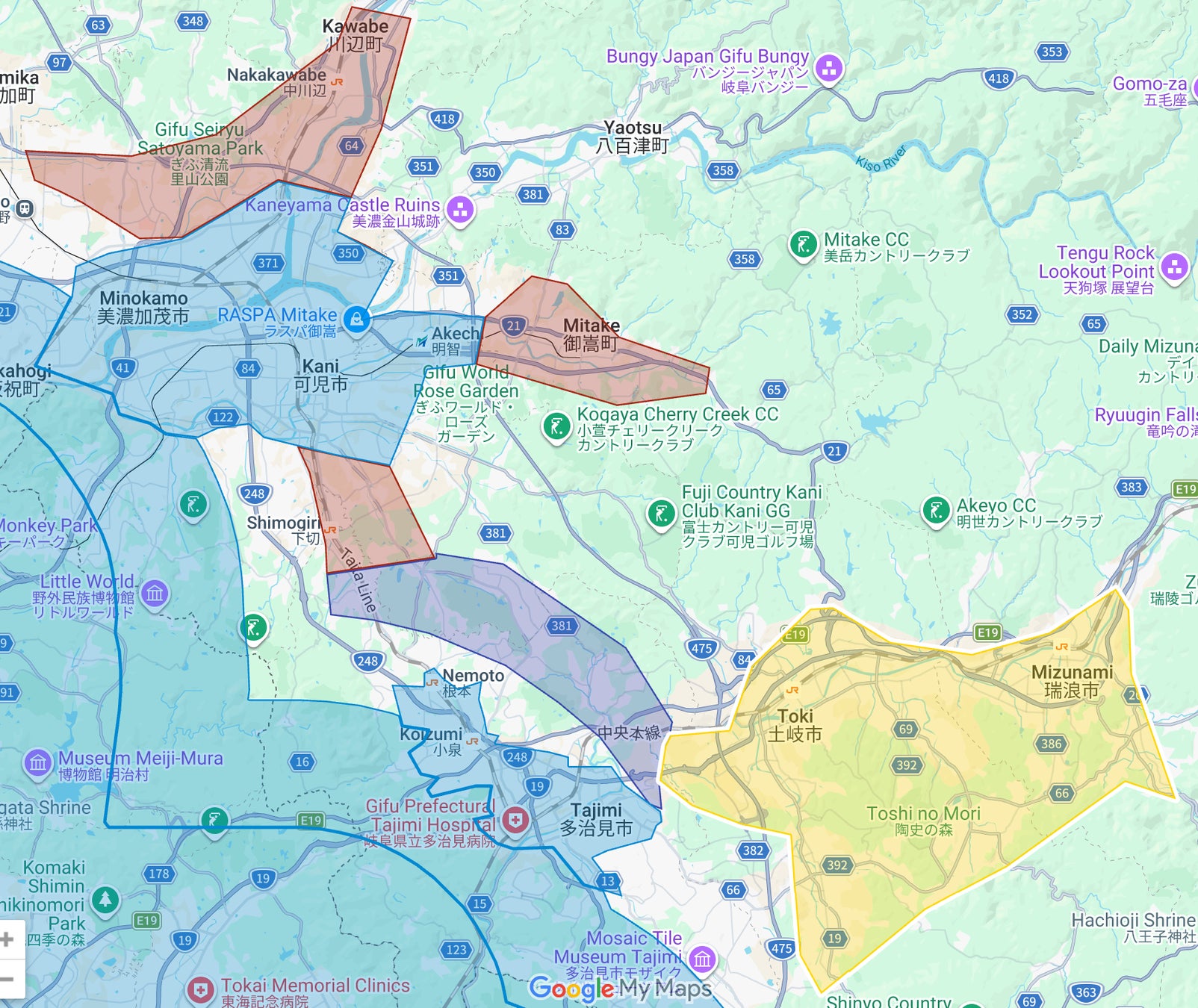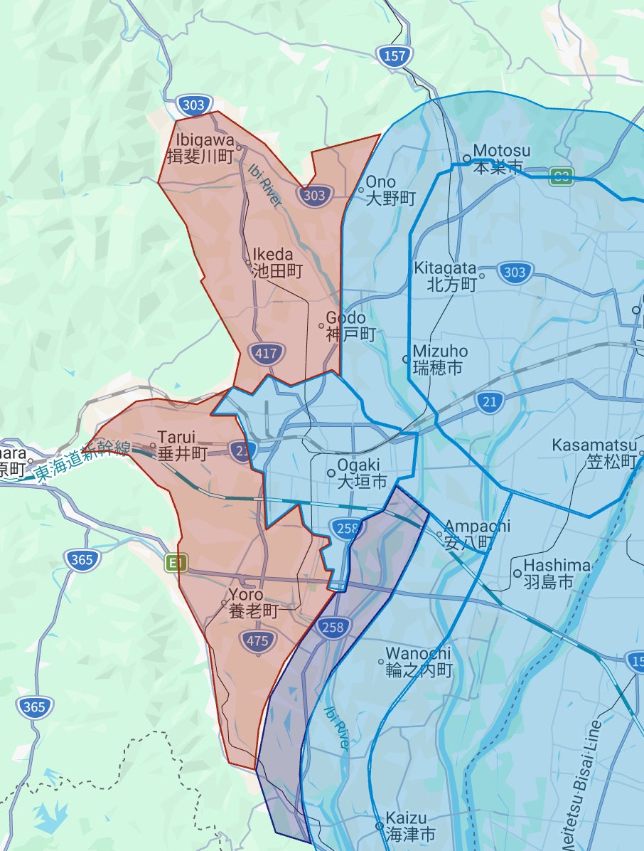 - 岐阜県:川辺町、中津川市、関ケ原町、瑞浪市、揖斐川町、垂井町、土岐市、恵那市、池田町(黄色・赤色部分。紫色・青色部分は既存提供エリア)