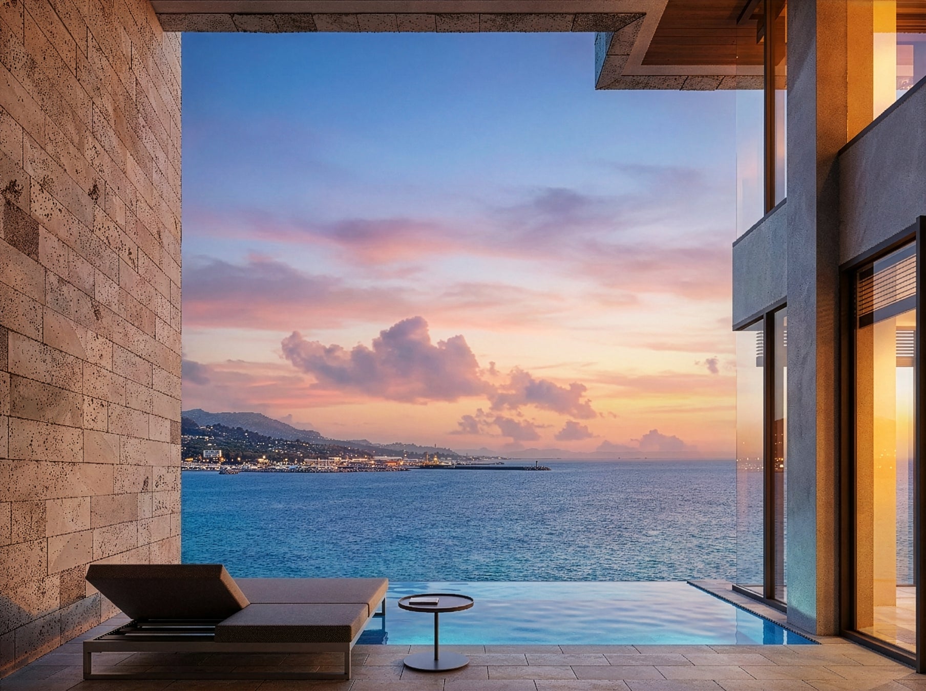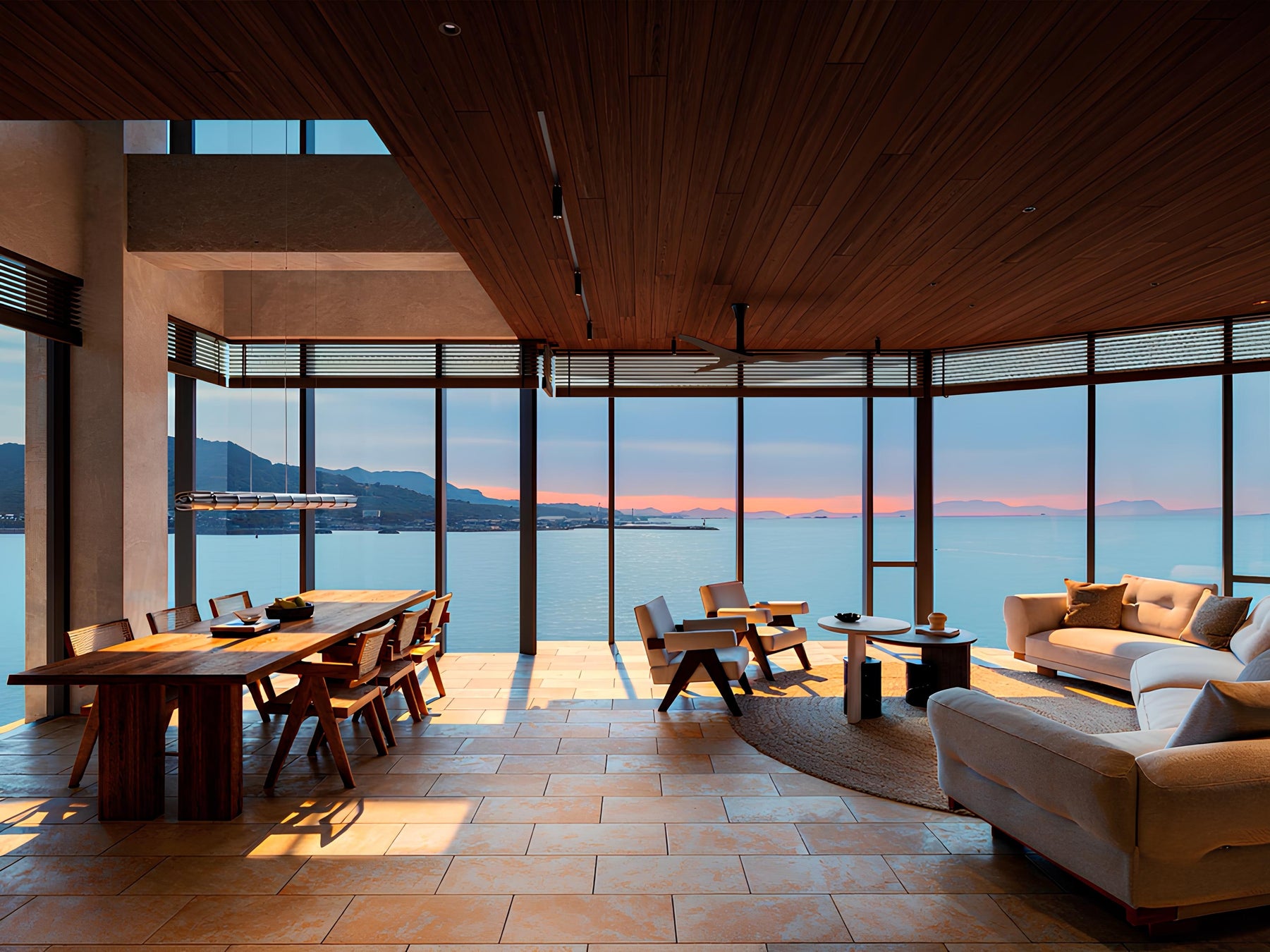 昼は空と海の開放感、夜には対岸の街の灯りが浮かび上がり、時間とともに表情を変える景色が滞在に静かなリズムをもたらします。