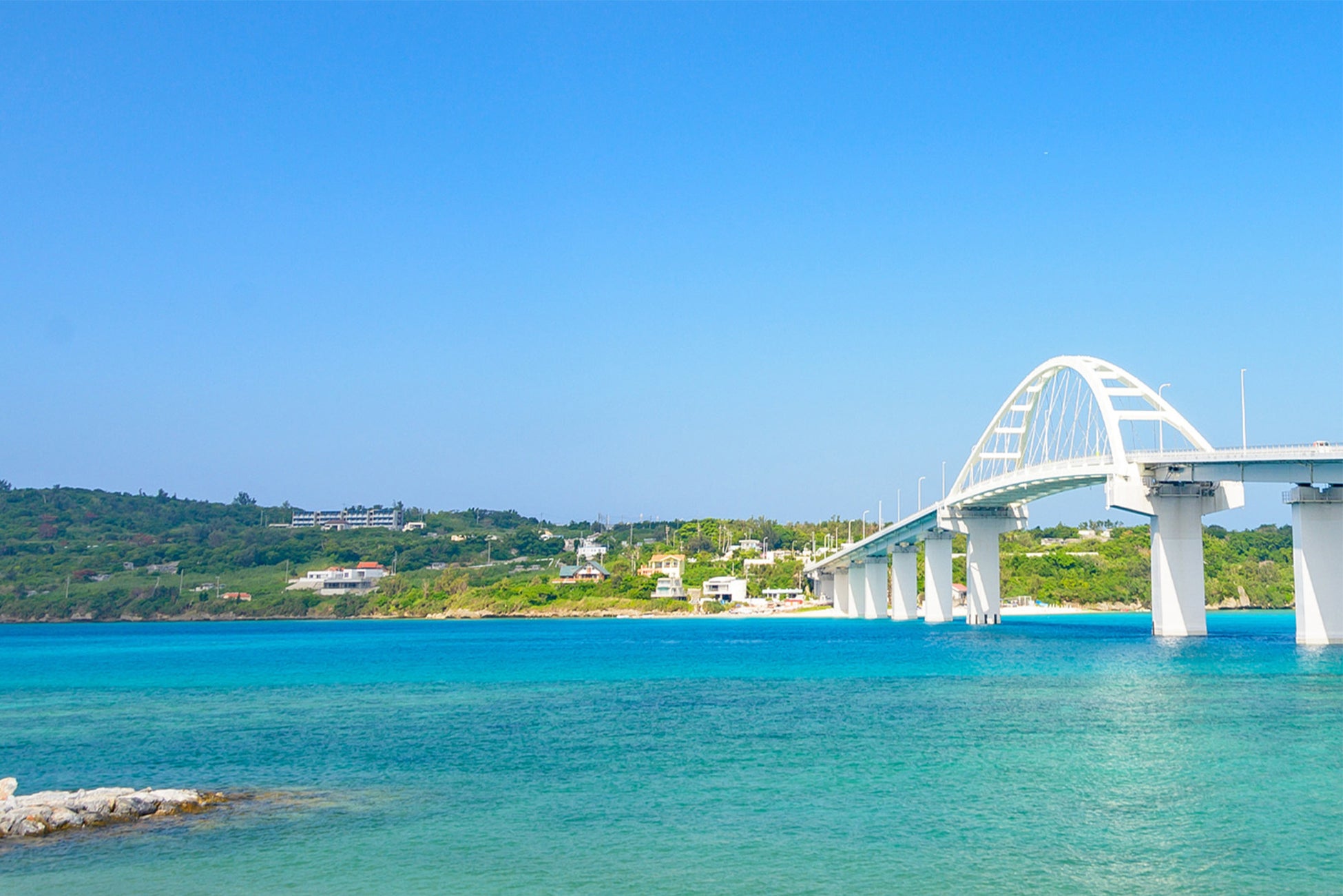 崖を切り開き、海岸線へと導かれるアプローチの先には、緑の植生と岩肌、そして視界いっぱいに広がるパノラマのオーシャンビューが現れ、沖縄本島へと続く橋の景観が重なります。