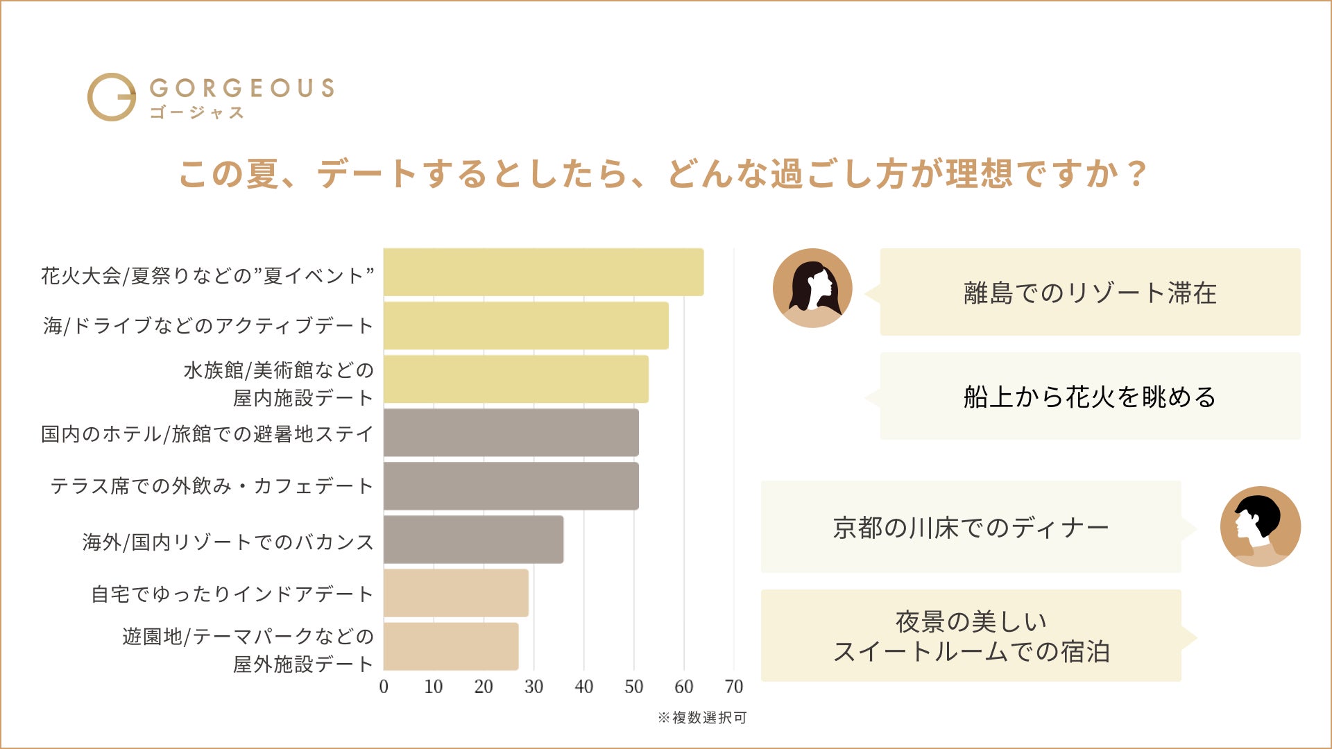 この夏、回答者の6割以上が、海外旅行や国内の高級ホテル・旅館での滞在を計画。理想の夏デートとしては、「離島でのリゾート滞在」や「船上から花火を眺める」など、非日常や特別感を重視する声が多く寄せられました。