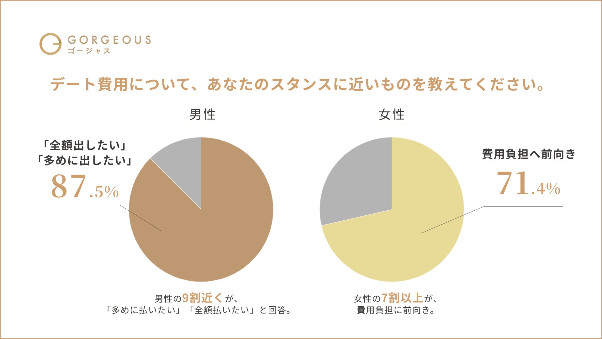 「スマートな振る舞いでリードしたい」という理由で、87.5%の男性が“多めに払いたい”と回答。3人に1人は「1回のデートで5万円以上」としており、金額を惜しまない姿勢が明らかに。 - 女性の7割が“費用負担にも前向き”な姿勢。恋愛もフラットな関係を重視する傾向に