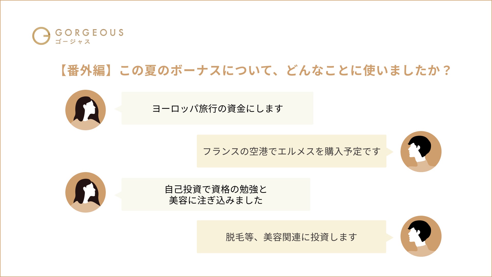 2022年10月サービスリリース。ゴージャスは、理想のお相手と出会いたいと考える男女をターゲットとした、「あなたにふさわしい、ハイクラスな出会い」を実現する完全審査制の恋活・婚活マッチングアプリです。 ゴージャスは、AIを用いた独自の審査を通過した会員のみが利用可能です。ハイクラスな出会いをご提供するため、あなたにふさわしいお相手を毎日ピックアップ。