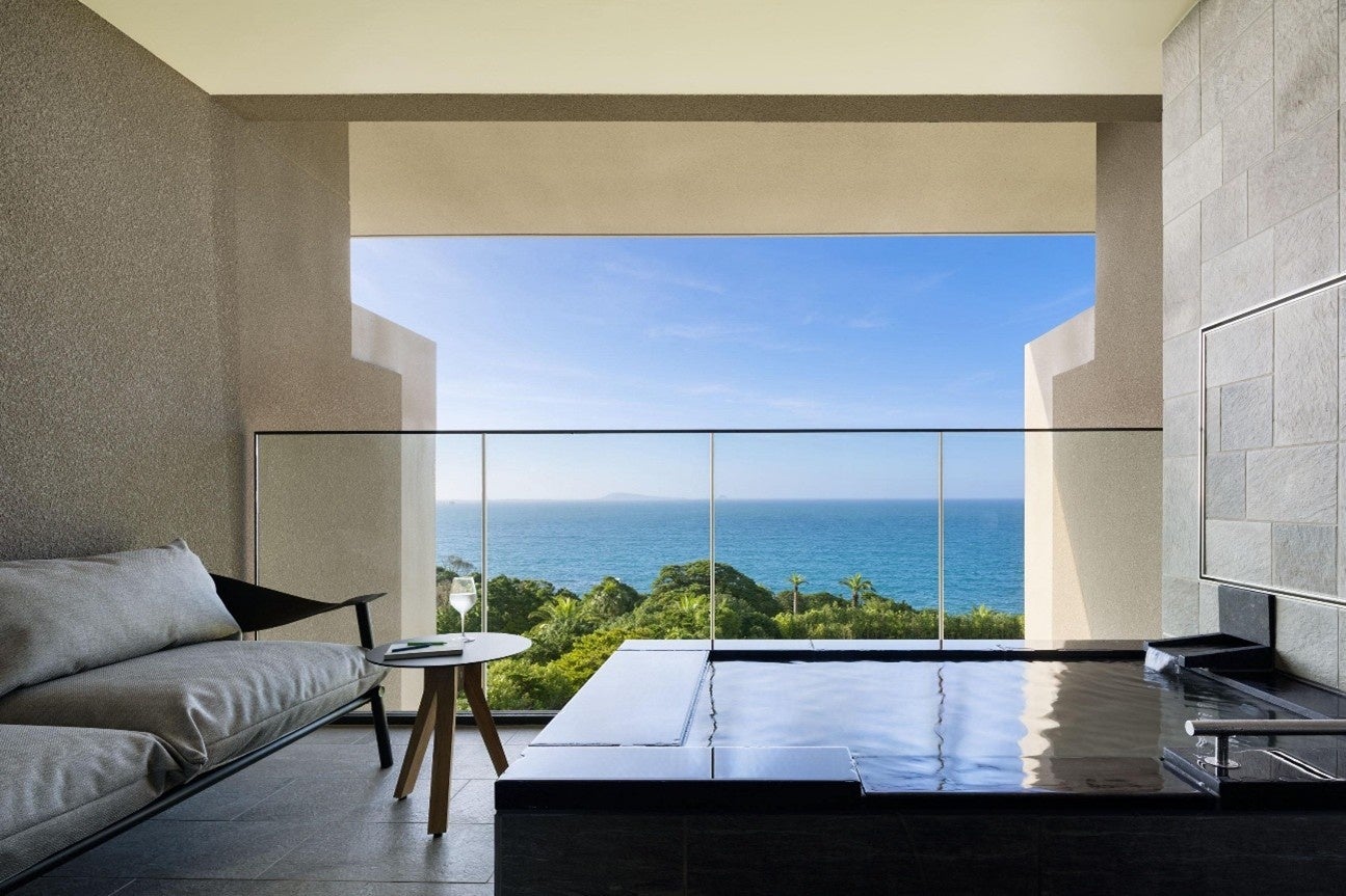 東シナ海を望む客室露天風呂で、約170年の歴史を持つ湯に身を委ねるひととき。