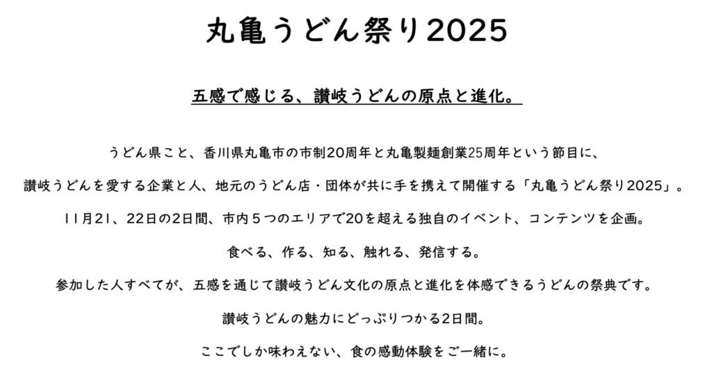 そして、本年実施となる「丸亀うどん祭り2025」は、これからの未来を創造する新たな出発点と捉え、市民の皆さま、地域のうどん店の皆さま、未来を担う子どもたち、そして全国から訪れるうどんを愛する人々と共に讃岐うどんの魅力を体験し、発見できるお祭りとなるよう五感の全てで味わう食の感動体験をお届けします。