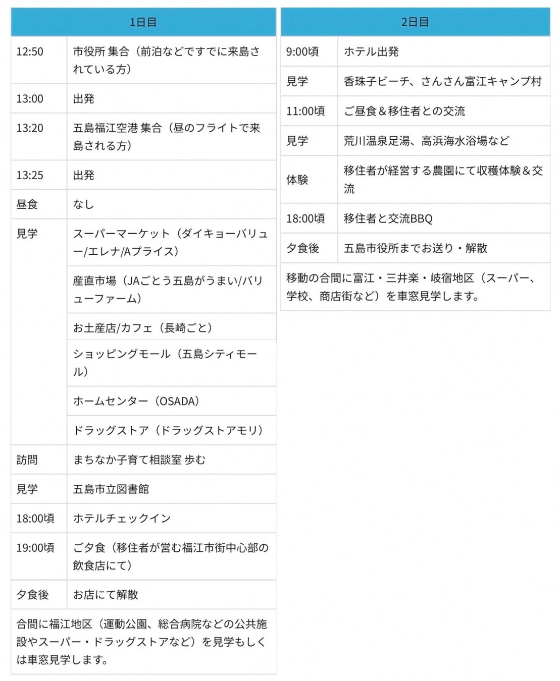 行程表。商業施設見学や移住者交流など、様々なプログラムを用意。