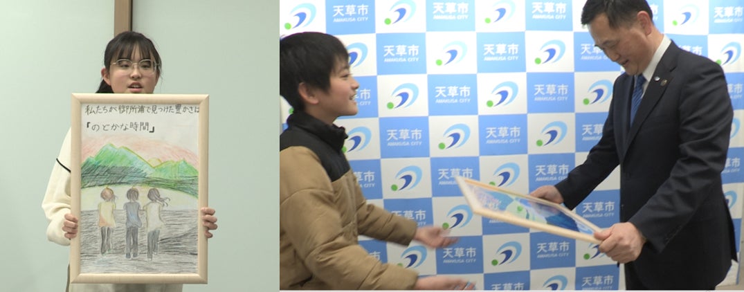 体験を通して、離島が大好きになった子どもたち。島にたくさんの人が来てくれることを願い、PRポスターを制作。このポスターを描いた理由などを発表し、天草市長に手渡しました。