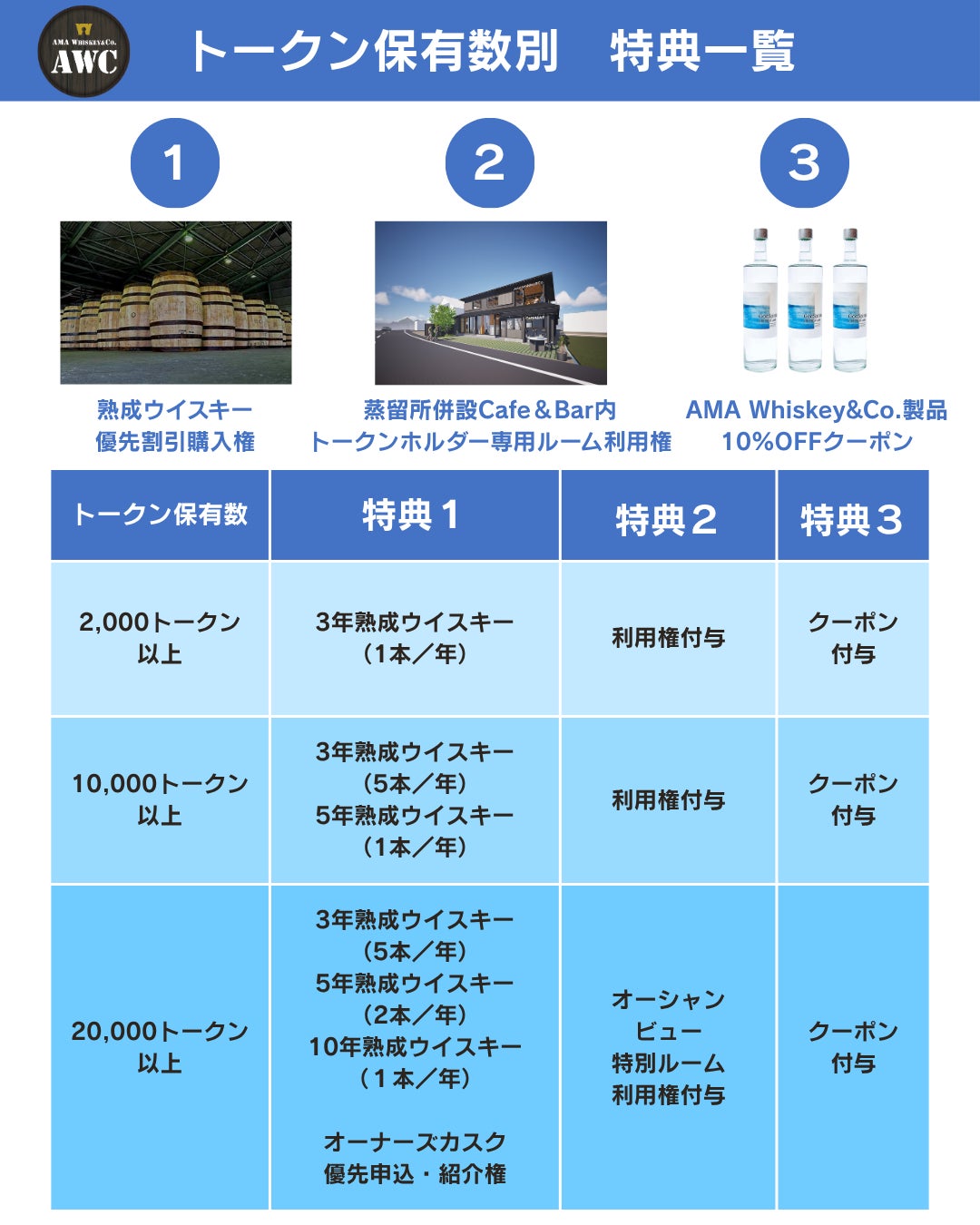 トークン「AWC」の保有者はその保有数に応じて、これから島で製造されるウイスキーの熟成もの(3年・5年・10年もの)を、島外からでも特別にオンライン購入できる権利や、オーナーズカスク(樽)の申込権を提供予定です。