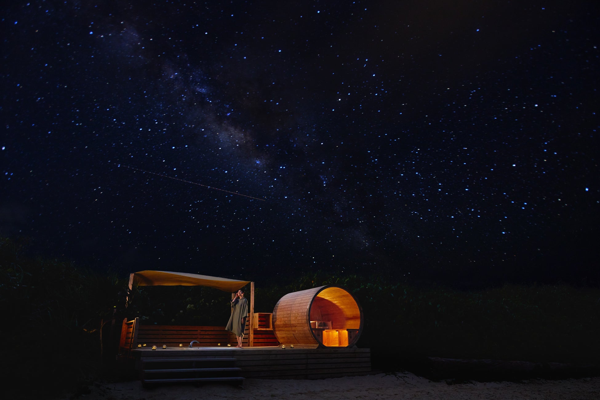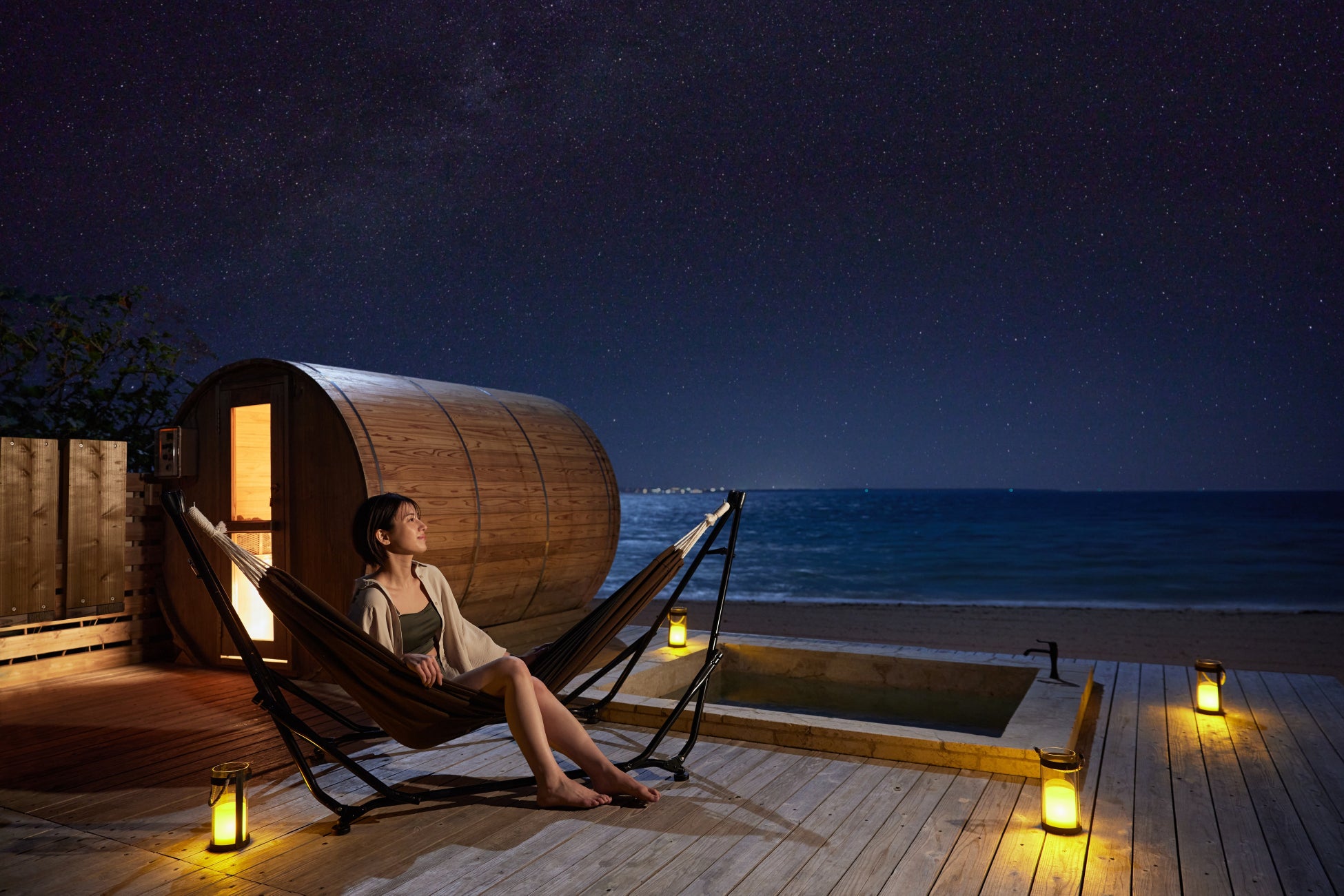 サウナで身体を温めた後は、夏の夜空にかかるティンガーラを眺めながらゆっくりと身体をととのえます。満天の星の下、波の音を聴きながら水風呂に入った後は、同スペースに用意されたハンモックで外気浴を満喫。静かな夜のビーチで、心地よい海風に包まれながら、心も身体もリラックスすることができる贅沢な空間です。