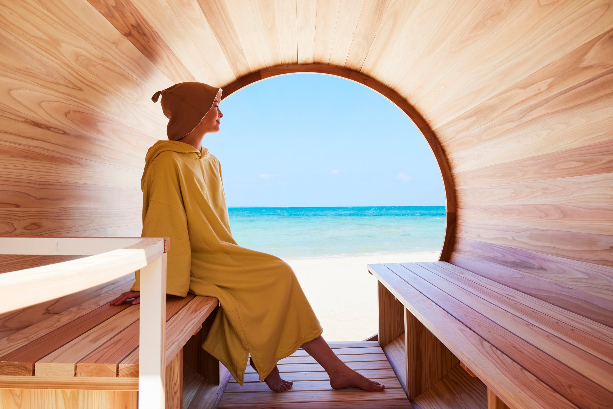 ホテルに隣接するビーチに佇むバレルサウナでは、2024年6月1日よりサウナアクティビティの通年販売を開始しています。国内最大のサンゴ礁「石西礁湖(せきせいしょうこ)」が創り出す絶景を目の前に、心地良く流れる海風でととのう体験を、年間を通して楽しむことができます。
