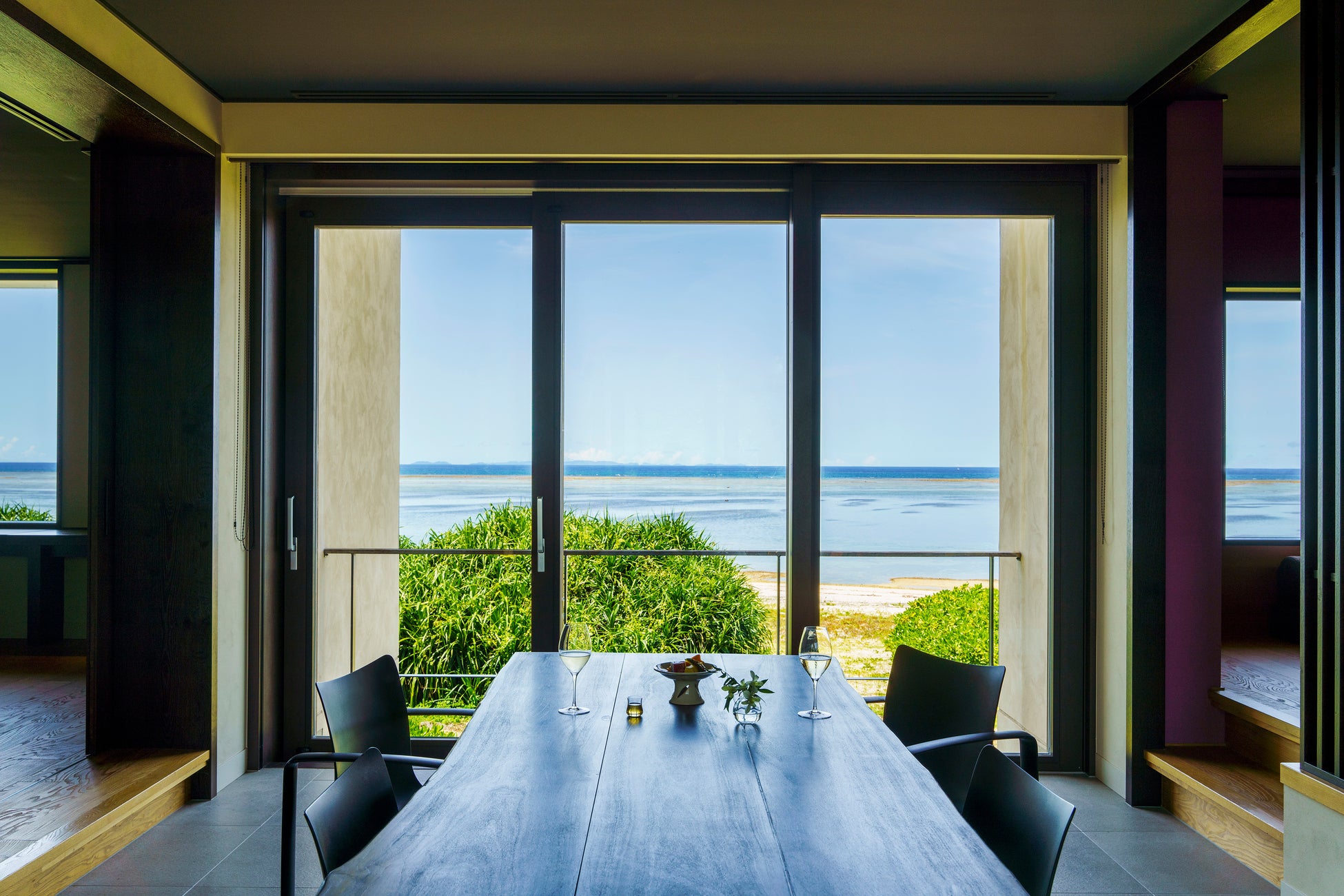 幸せを運ぶと伝えられ、縁起の良い風とされる南風(パイカジ)。あたたかな南風を迎え入れるため、すべての客室の南側に壁一面のガラス戸があります。反対の北側のガラス戸とともに開放すれば、客室の中を風が通り抜け、心地よい風を感じることができます。また、開放的な空間で食事もたのしめます。