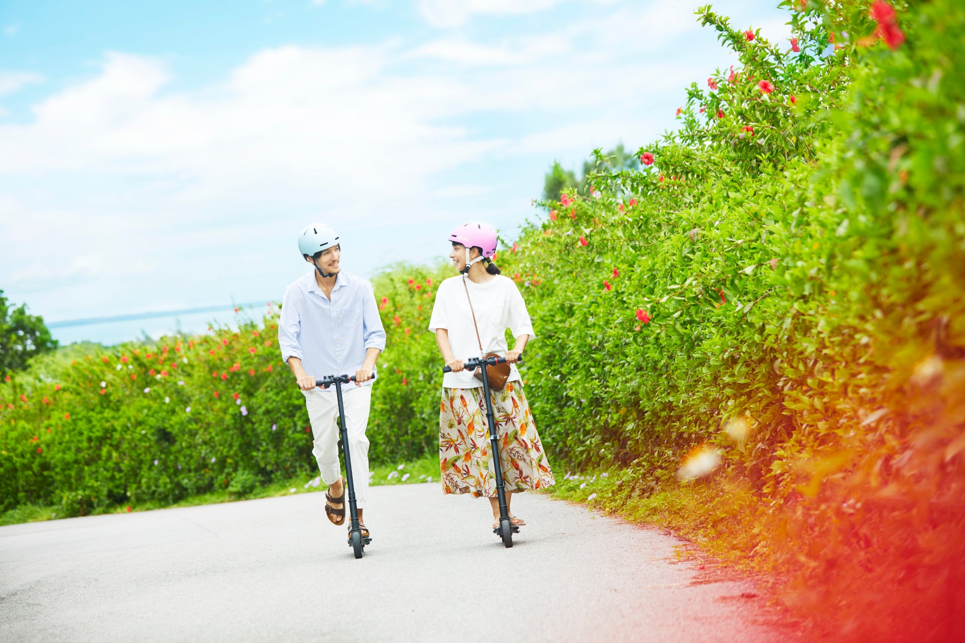 リゾナーレ小浜島のリゾート内は、電動キックボードに乗って探検できます。小さいお子様用のキックボードもあり、家族みんなで参加可能です。また冬でも温暖な小浜島では、南国ならではの花々が咲き誇ります。特に冬の時期にはブーゲンビリアが咲き、ビーチへと続く道を鮮やかに彩ります。心地よい風を感じながら家族でリゾート内を回り、八重山の自然を肌で感じる体験です。