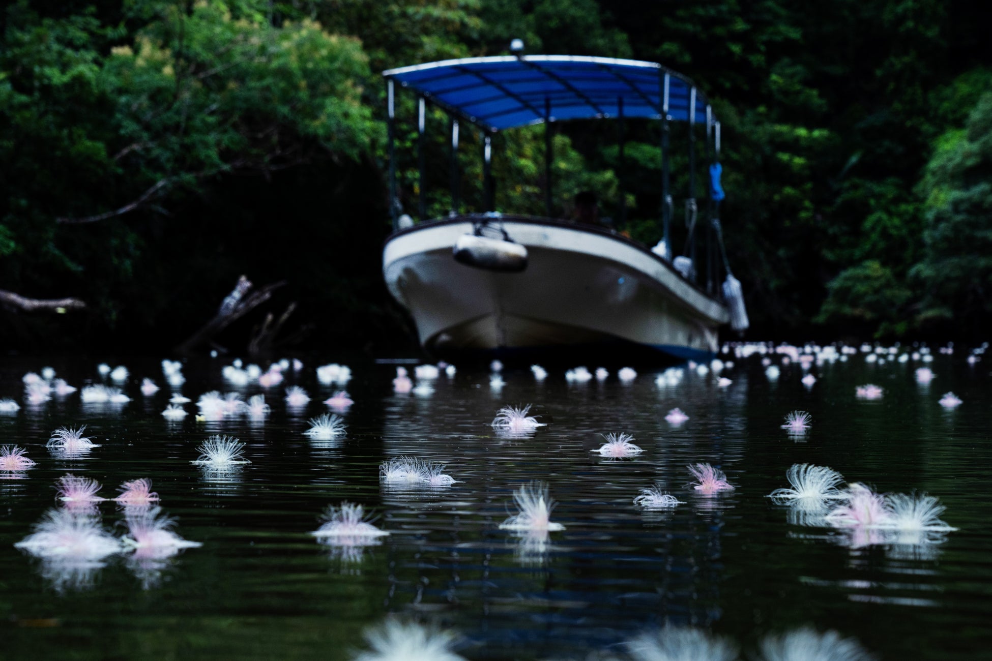 まだ誰も起きていない早朝の静けさの中、チャーター船に乗り、サガリバナの絶景ポイントを目指しま